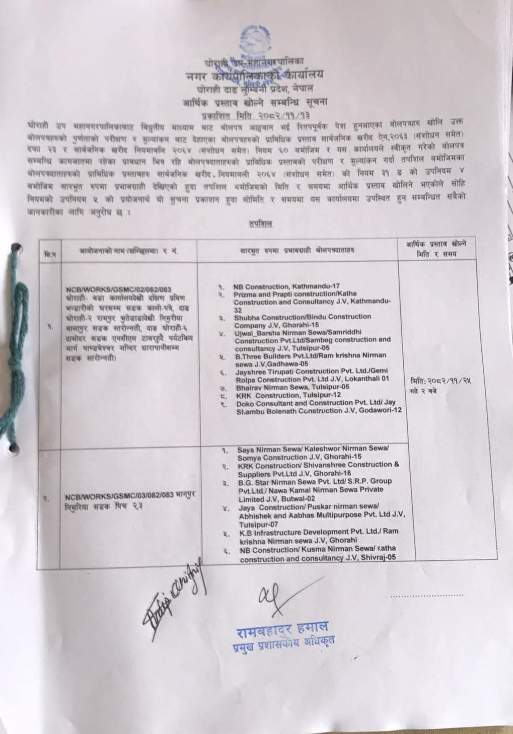 आर्थिक प्रस्ताव खोल्ने सम्बन्धी सूचना (२०८२|११|१३)