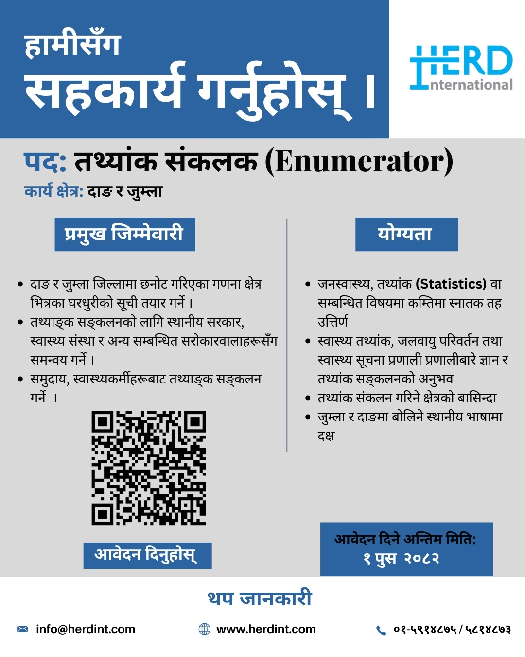 घोराही उप-महानगरपालिका र HERD इन्टरनेशनलबीचको सहकार्यमा कार्यान्वयन भइरहेको REACT अनुसन्धान परियोजना अन्तर्गत फिल्ड एनुमेरेटरको पदको लागि सूचना ( मिति २०८२/०८/२३ )