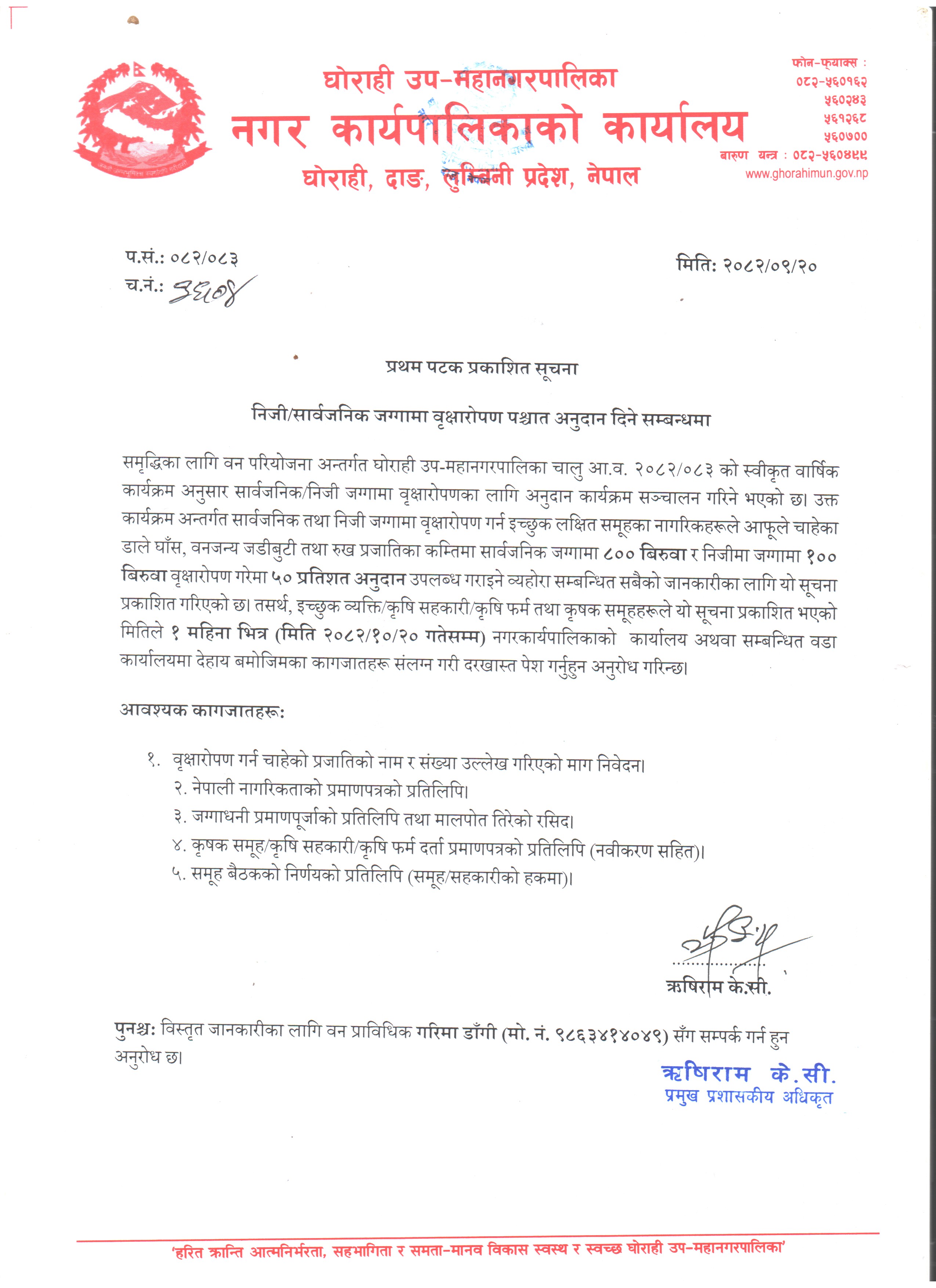 नीजि सार्वजनिक जग्गामा वृक्षरोपण पश्‍चात अनुदान दिने सम्बन्धमा ( मिति २०८२/०९/२० )