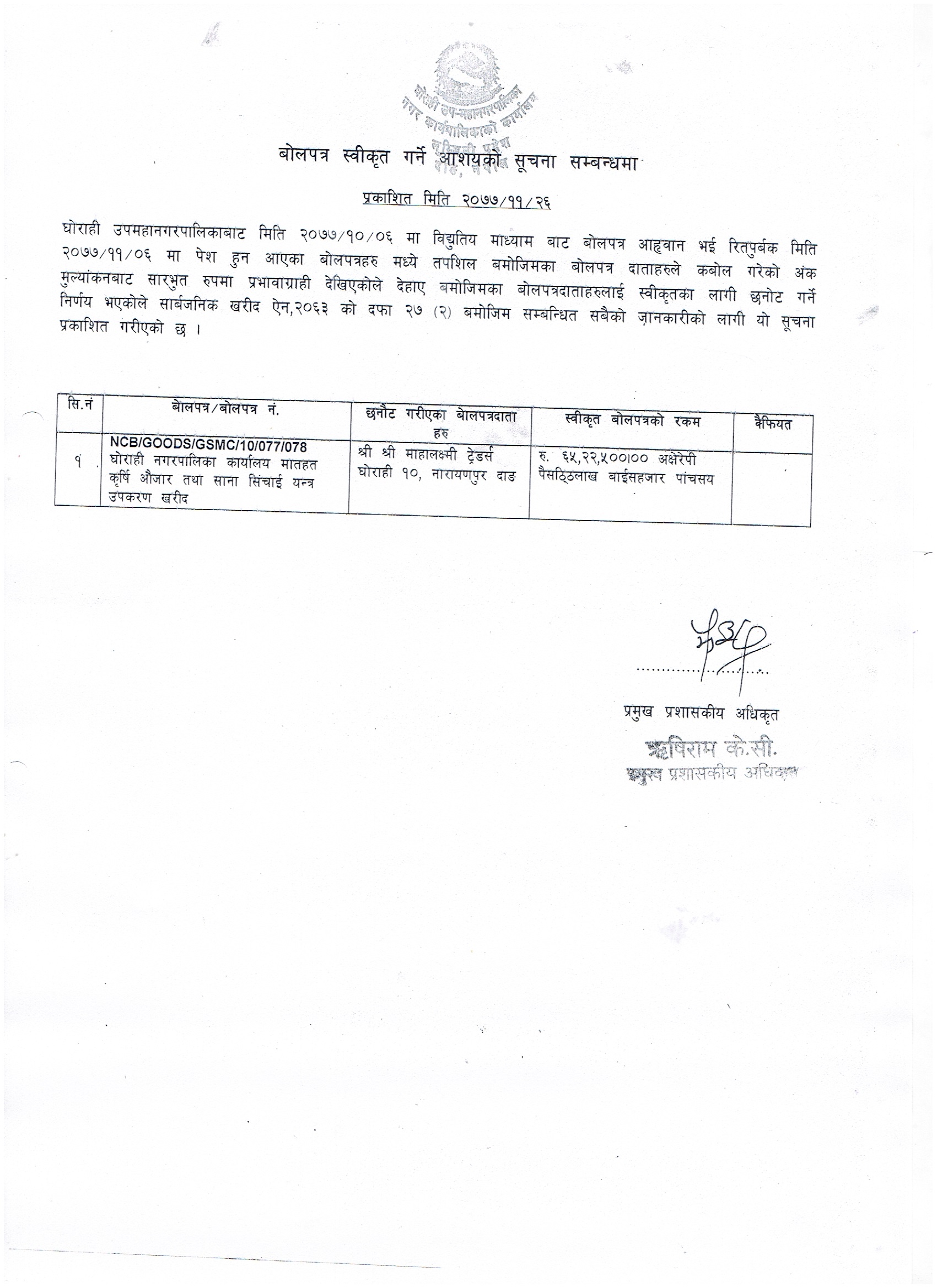 बोलपत्र स्विकृत गरिएको सूचना (२०७७/११/२५)