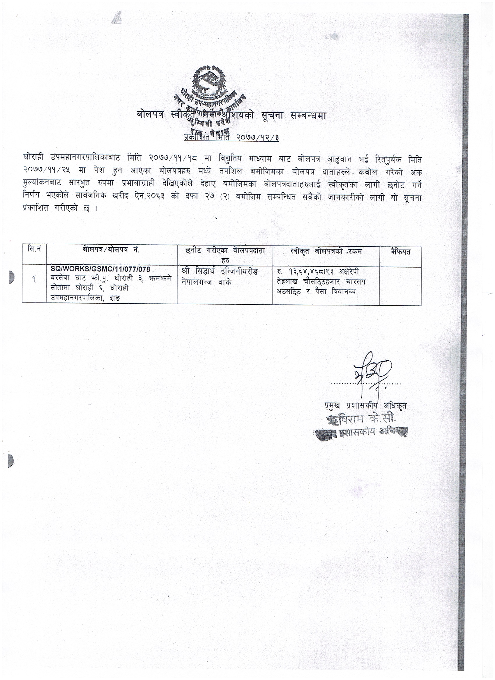 बोलपत्र स्विकृत गरिएको सूचना (२०७७/१२/०३)