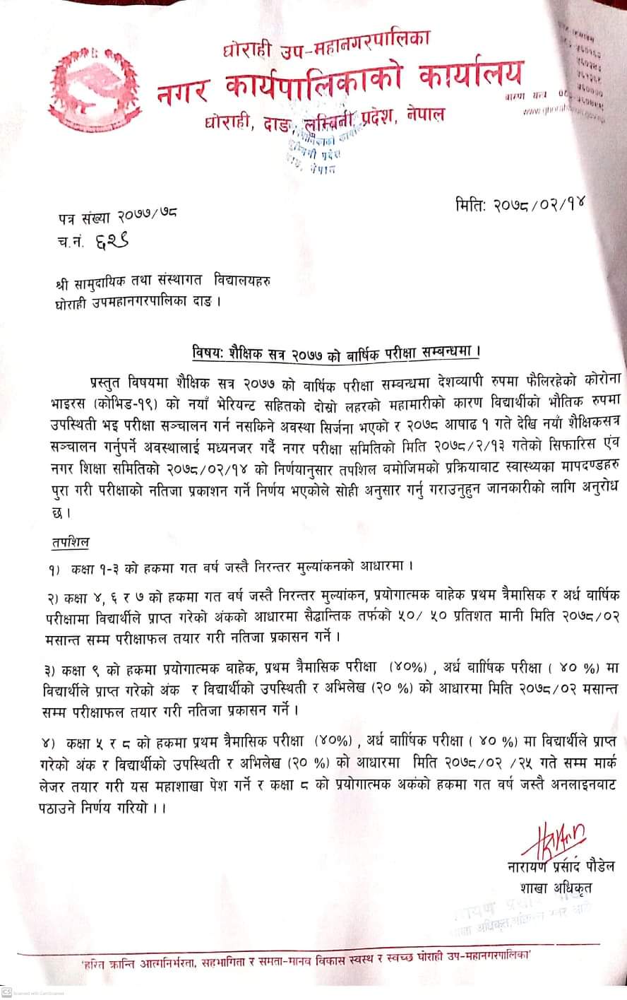 वार्षिक परिक्षा सम्बन्धमा ( सबै विद्यालयहरु , २०७८/०२/१४)